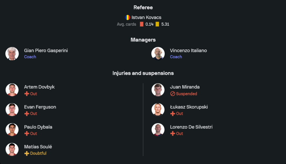 โรม่า ของ จาน ปิเอโร่ กาสเปรินี่ มีข่าวดีตรงที่ จานลูก้า มันชินี่ พ้นโทษแบนกลับมาช่วยแนวรับได้อีกครั้ง เช่นเดียวกับ เอวาน เอ็นดิกก้า ที่พร้อมคืนสนาม ส่วน เวสลีย์ ยังลงรายการนี้ได้ตามปกติ แม้จะติดแบนในลีกก็ตาม อย่างไรก็ตาม ปัญหายังอยู่ที่ตัวเจ็บหลายราย ทั้ง เปาโล ดิบาล่า, อาร์เต็ม ดอฟบิค, เอวาน เฟอร์กูสัน และ มาติอัส ซูเล่ ทำให้เกมรุกเสียความหลากหลายพอสมควร เกมนี้คาดว่าจะมาในระบบ 3-4-2-1 ใช้ ไมล์ สวิลาร์ เฝ้าเสา แนวรุกมี นิโคโล่ ปิซิลลี่ กับ ลอเรนโซ่ เปเยกรินี่ ปั้นเกมอยู่ด้านหลัง ดอนเยลล์ มาเลน ที่ยืนเป็นหน้าเป้า