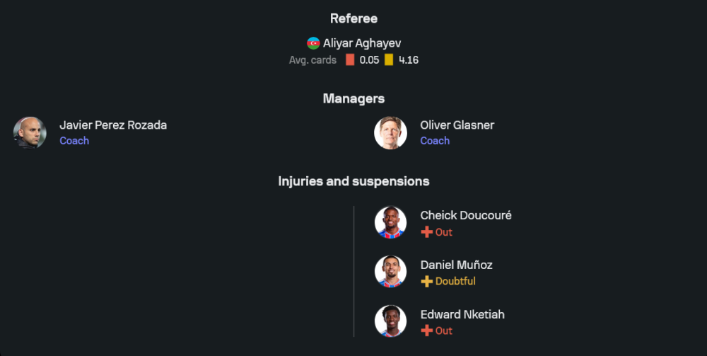 ฝั่งทีมเยือนของ โอลิเวอร์ กลาสเนอร์ ยังไม่มี ดีน เฮนเดอร์สัน, เอ็ดดี้ เอ็นเคเตียห์ และ ดาเนี่ยล มูนญอซ ที่ยังไม่พร้อมใช้งาน แต่ขุมกำลังหลักส่วนใหญ่ยังถือว่าอยู่กันครบ คาดว่าจะมาในระบบ 3-4-2-1 ตามถนัด วาง ยอร์เก้น สตรันด์ ลาร์เซ่น ยืนหน้าเป้า พร้อมให้ อิสไมล่า ซาร์ กับ อีวานน์ เกสซ็องด์ ปั้นเกมรุกอยู่ด้านหลัง ขณะที่แดนกลางมี อดัม วาร์ตัน กับ ไดจิ คามาดะ คอยคุมจังหวะ ข้อได้เปรียบของพาเลซคือความเร็วและคุณภาพเกมรุก แต่ปัญหายังอยู่ที่ความคมในพื้นที่สุดท้าย