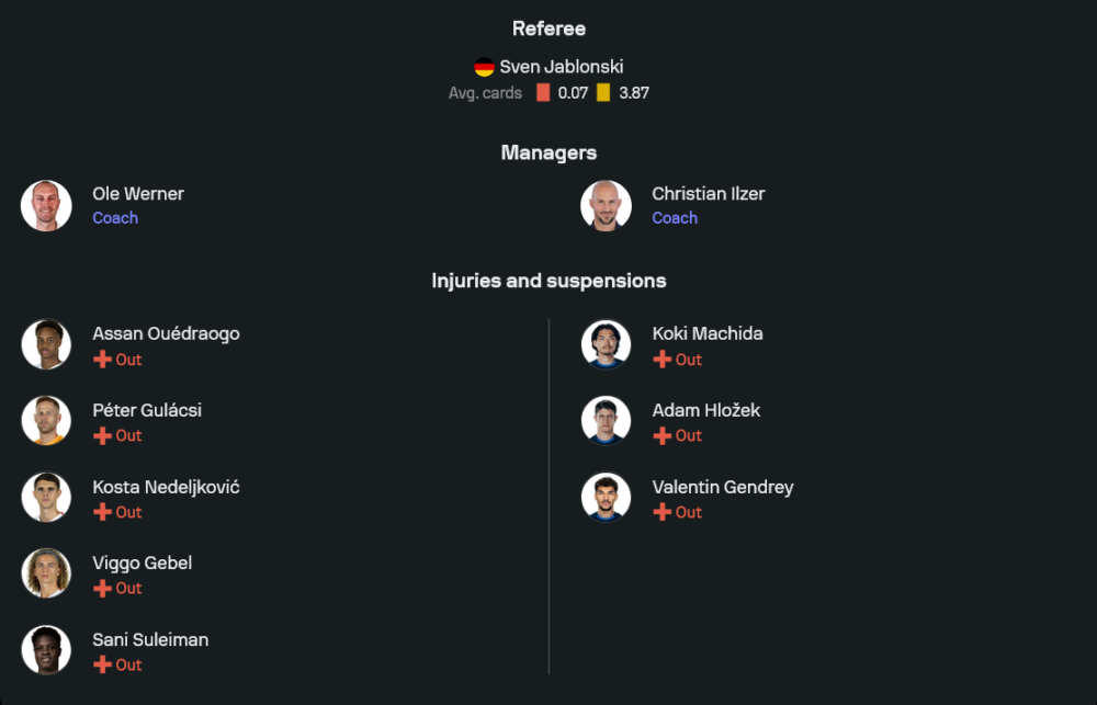 ฮอฟเฟ่นไฮม์ของ คริสเตียน อิลเซอร์ นัดล่าสุดทำได้เพียงเสมอโวล์ฟสบวร์ก 1-1 แต่ภาพรวมยังเป็นทีมที่เล่นด้วยยาก เกมนี้คาดว่าจะปรับมาใช้ระบบ 4-2-3-1 เน้นเกมรุกมากขึ้น โดยมี อเล็กซานเดอร์ พรัสส์ กับ บาซูมาน่า ตูเร่ ขึ้นเกมด้านข้าง และใช้ ฟิสนิค อัสลานี่ ยืนค้ำจบสกอร์ แม้จะขาด วาล็องแต็ง ฌ็องเดรย์, โกกิ มาชิดะ และ อดัม ฮโลเซ็ค แต่โครงสร้างหลักยังอยู่ครบ โดยเฉพาะเกมเยือนที่แข็งพอตัว ลงเล่น 13 นัด ชนะ 7 เสมอ 4 แพ้เพียง 2 นัด