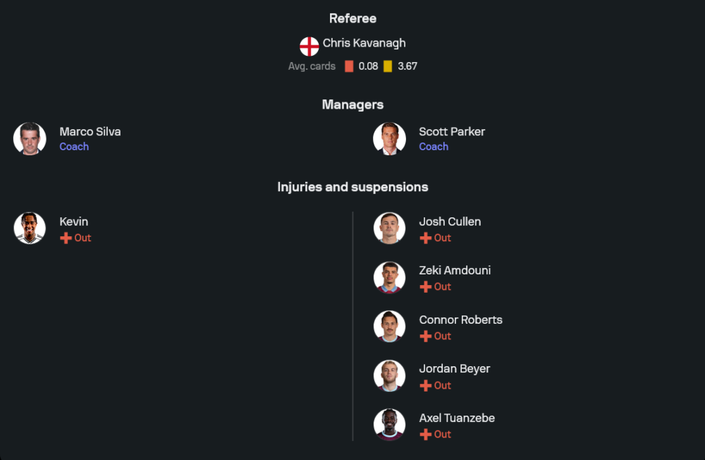 มาร์โก ซิลวา มีปัญหาไม่มากนัก ตัวที่ยังไม่พร้อมมีเพียง เควิน รายเดียว ขุมกำลังหลักที่เหลือยังอยู่กันครบ คาดว่าจะจัดทัพในระบบ 4-2-3-1 โดยมี แบร์นด์ เลโน่ เฝ้าเสา แนวรับใช้ เคนนี่ เตเต้, โยอาคิม แอนเดอร์สัน, แคลวิน บาสซี่ย์ และ แอนโธนี โรบินสัน แดนกลางวาง ซานเดอร์ เบอร์เก้ คุมจังหวะร่วมกับ อเล็กซ์ อิโวบี้ ส่วนเกมรุกฝากความหวังไว้ที่ แฮร์รี่ วิลสัน, โจชัว คิง, ซามูเอล บ็อบบ์ และ ราอูล ฆิเมเนซ ที่ยืนเป็นหน้าเป้า