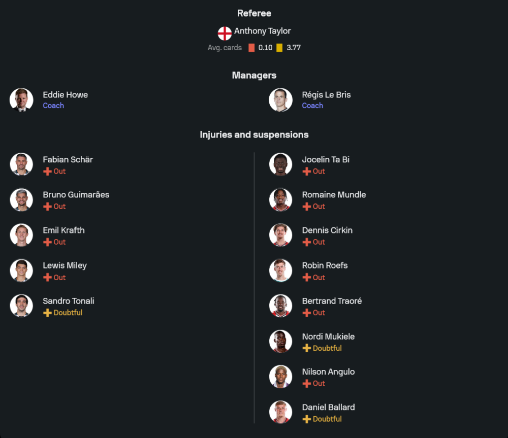 เอ็ดดี้ ฮาว ยังเจอปัญหาตัวเจ็บเล่นงานต่อเนื่อง ไม่ว่าจะเป็น บรูโน่ กีมาไรส์, ฟาเบียน ชาร์, เอมิล คราฟธ์ และ ลูอิส ไมลี่ย์ ส่วน ซานโดร โตนาลี่ ยังต้องลุ้นความฟิต แต่โครงสร้างหลักยังพอประคองได้ดี เกมนี้คาดว่าจะมาในระบบ 4-2-3-1 ใช้ อารอน แรมสเดล ยืนเฝ้าเสา แนวรับมี ทริปเปียร์, มาลิค เธียว, บ็อตมัน และ ลูอิส ฮอลล์ แดนกลางวาง ติอาโว กับ โชเอลินตอน คอยคุมจังหวะ ส่วนเกมรุกฝากความหวังไว้กับ เมอร์ฟี่, กอร์ดอน, บาร์นส์ และตัวจบสกอร์อย่าง วิลล็อค จุดเด่นของทีมยังอยู่ที่ความเร็วริมเส้นและเกมบุกในบ้านที่พร้อมกดใส่คู่แข่งแบบไม่ให้หายใจสะดวก