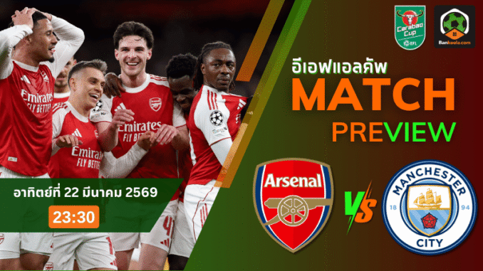 ศึกคาราบาว คัพ รอบชิงชนะเลิศ คืนวันอาทิตย์ที่ 22 มีนาคม 2569 เวลา 23:30 น. คือหนึ่งในคู่เอกของ ตารางบอลวันนี้ แบบไม่ต้องเถียง เมื่อ อาร์เซนอล ดวล แมนเชสเตอร์ ซิตี้ ที่เวมบลีย์ สเตเดี้ยม สนามกลางที่พร้อมตัดสินทุกอย่างในคืนเดียว ราคาบอลเปิดให้ปืนใหญ่ต่อ 0.25 สะท้อนว่าฟอร์มระยะหลังของทีม มิเกล อาร์เตต้า ดูน่าเชียร์กว่าเล็กน้อย แต่กับเกมนัดชิงที่เดิมพันสูงแบบนี้ ความผิดพลาดเพียงครั้งเดียวอาจเปลี่ยนทั้งเรื่องราวของเกมได้ทันที