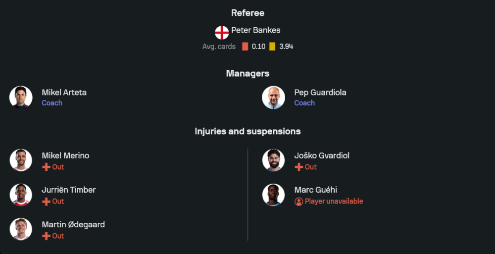 แมนฯซิตี้ของ เป๊ป กวาร์ดิโอล่า มีปัญหาในแนวรับเหมือนกัน เมื่อจะไม่มี ยอสโก้ กวาร์ดิโอล และ มาร์ก เกอี ที่ติดเงื่อนไขใช้งานไม่ได้ คาดว่าจะจัดทัพในระบบ 4-2-3-1 โดยให้ โรดริโก้ เอร์นานเดซ คุมจังหวะอยู่หน้าแผงหลัง และใช้ แบร์นาร์โด้ ซิลวา เป็นตัวสร้างสรรค์เกม