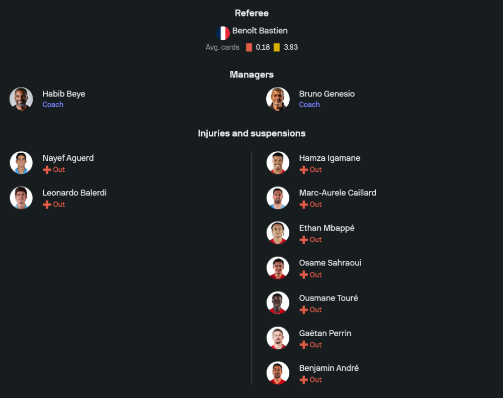 ลีลล์ก็มาในระบบ 4-2-3-1 เช่นกัน ผู้รักษาประตูเป็นโอเซอร์ แผงหลังมี มูนิเยร์, เอ็นกอย, ม็องดี้ และแวร์ดองค์ แดนกลางใช้ มูเกา กับ เบนทาเล็บ ส่วนสามตัวรุกวาง กอร์เรอา, บูอัดดี้ และฮารัลด์สสัน คอยสนับสนุน แฟร์นานเดซ ปาร์โด้ ที่ยืนหน้าเป้า ทีมเยือนมีจุดแข็งที่เกมรับเป็นระเบียบและสวนกลับอันตราย แต่ก็ยังมีปัญหาตัวเจ็บหลายราย ทั้ง กายาร์, อิกามาเน, อีธาน เอ็มบัปเป้, เบนฌาแม็ง อองเดร, กาเอต็อง แปร์แร็ง, ซาห์ราอุย และอุสมาน ตูเร่ ทำให้ตัวเลือกในการหมุนเกมลดลงพอสมควร
