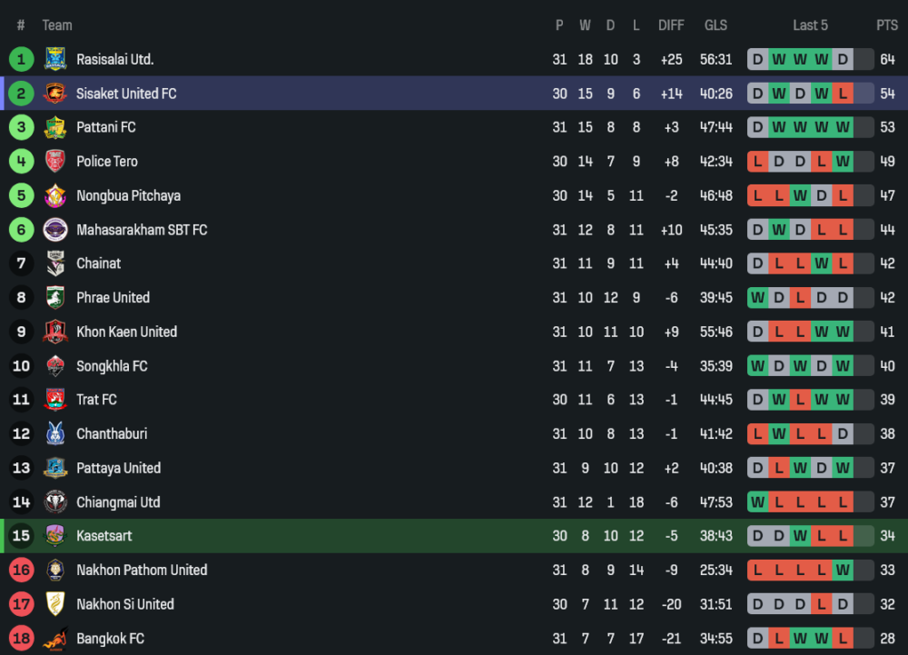 เมื่อดูอันดับตาราง ศรีสะเกษอยู่อันดับ 2 มี 54 แต้มจาก 30 นัด ส่วนเกษตรศาสตร์อยู่อันดับ 15 มี 34 แต้มจาก 30 นัด ช่องว่างตรงนี้สะท้อนชัดว่าทีมเยือนมีทั้งคุณภาพและความมั่นใจเหนือกว่า