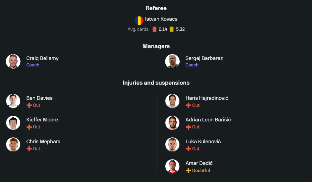 เวลส์ของ เคร็ก เบลลามี กำลังเรียกความมั่นใจกลับมา หลังชนะ 2 เกมติดในรอบคัดเลือก แต่เกมนี้ยังมีปัญหาผู้เล่นบาดเจ็บหลายราย ทั้ง เบน เดวีส์, คริส เมแฟม และ คีฟเฟอร์ มัวร์ ที่หมดสิทธิ์ลงสนาม อย่างไรก็ตาม ตัวหลักในเกมรุกยังพร้อมทำงาน คาดว่าจะยึดแผน 4-1-4-1 โดยใช้ อีธาน อัมพาดู คุมแดนกลาง ปล่อยให้ แดเนียล เจมส์, แฮร์รี วิลสัน และ เดวิด บรูคส์ ปั้นเกมสนับสนุน เบรนแนน จอห์นสัน ในแดนหน้า จุดเด่นของเวลส์คือความเร็วและการขึ้นเกมจากด้านข้างที่พร้อมสร้างปัญหาให้แนวรับทีมเยือนตลอดทั้งเกม