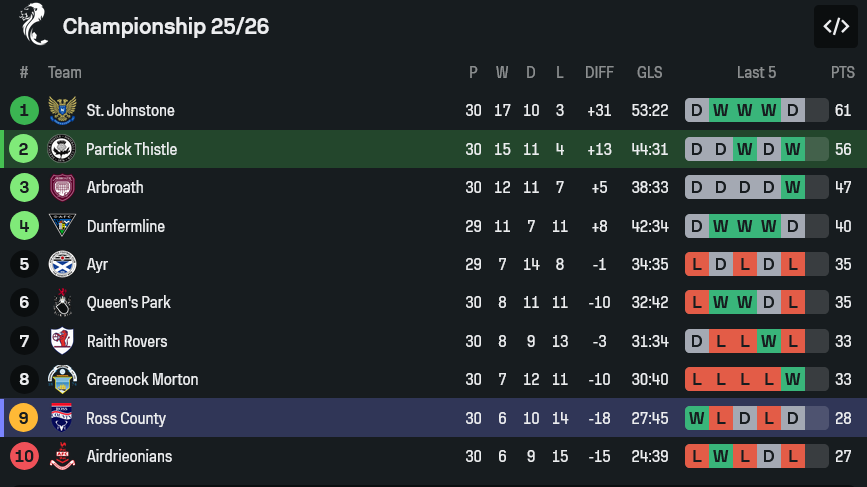 รอสส์ เคาน์ตี้ ยังอยู่ในช่วงน่าเป็นห่วง หลังไม่ชนะใครมา 4 นัดติด แถมเกมนี้ยังขาด ชอน แม็คกี้ ที่ติดโทษแบน และ อูเช่ อิคเปียซู ที่ไปรับใช้ทีมชาติ ทำให้แผน 4-1-3-2 ต้องมีการปรับพอสมควร จุดที่ยังพอฝากความหวังได้คือ เคียแรน ฟิลลิปส์ กองหน้าตัวเก่งที่ยังเป็นอาวุธหลักในแดนหน้า แต่ภาพรวมทีมยังดูมีรอยรั่วพอสมควร โดยเฉพาะเวลาเล่นเกมเยือน