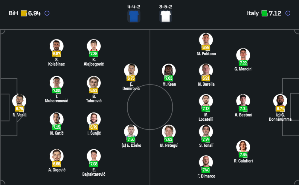 อิตาลีชนะ 4 จาก 5 นัดหลังสุด แม้จะมีสะดุดแพ้นอร์เวย์ 1-4 แต่ผลงานโดยรวมยังแข็งแรงมาก จากชัยชนะเหนือเอสโตเนีย, อิสราเอล, มอลโดว่า และไอร์แลนด์เหนือ สิ่งที่เด่นคือทีมเล่นเป็นระบบ คุมเกมได้ดี และมีความนิ่งเวลาเข้าทำ ทำให้ภาพรวมยังดูเหนือกว่าบอสเนียชัดเจน
