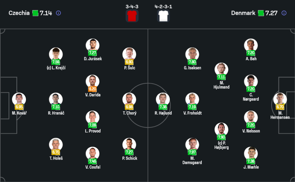เช็ก (3-4-3) : มาเตจ์ โควาร์ – โทมัส โฮลส์, ลาดิสลาฟ เครย์ชี่, โรบิน ฮราเน็ค – วลาดิเมียร์ คูฟาล, ลูคัส โพรว็อด, โทมัส ซูเช็ค, ดาวิด ยูราเซ็ค – ปาทริค ชิค, โทมัส ชอรี่, พาเวล ซุลช์