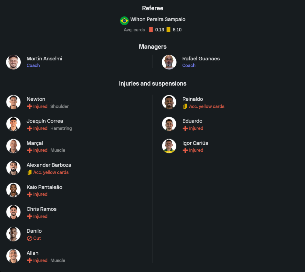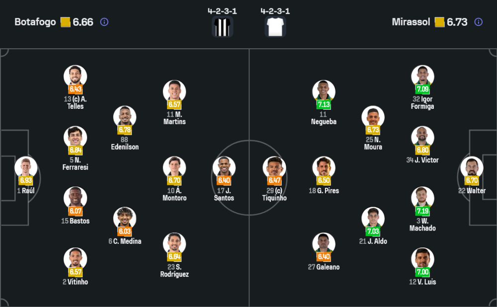 ทีมเยือนของกุนซือ ราฟาเอล กัวเนส ก็มีตัวขาดเหมือนกัน ไม่ว่าจะเป็น โฆเซ่ อัลโด, เรนัลโด้, เอดูอาร์โด้ และอิกอร์ คาริอุส ที่ไม่พร้อมใช้งาน ทำให้เกมนี้ต้องจัดชุดที่เน้นความรัดกุมเป็นหลัก คาดว่าจะยืนระบบ 4-2-3-1 เช่นกัน โดยใช้ เนเกบ้า, กาเบรียล ปิเรส และอันโตนิโอ กาเลอาโน่ คอยปั้นเกมให้ ติกินโญ่ โซอาเรส ล่าตาข่าย จุดเด่นของมิราสโซลคือการครองบอลที่ดูนิ่งกว่า แต่ปัญหาคือการจบสกอร์ยังไม่เฉียบคมพอ