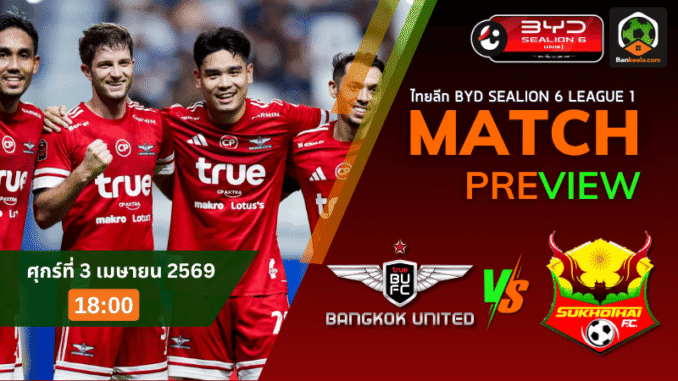 ศึก BYD SEALION 6 ลีกหนึ่ง วันศุกร์ที่ 3 เมษายน 2569 เวลา 18:00 น. คู่นี้ถือว่าเด่นพอตัวใน ตารางบอลวันนี้ เมื่อ ทรู แบงค็อก ยูไนเต็ด เปิดบ้านรับมือ สุโขทัย เอฟซี โดยราคาบอลวันนี้เปิดมาที่ 1.5/2 สะท้อนชัดว่าเจ้าถิ่นถูกยกให้เหนือกว่าแบบเห็นภาพ ทั้งเรื่องฟอร์ม คุณภาพทีม และความอันตรายในเกมรุก แบงค็อกยังอยู่ในกลุ่มหัวตาราง ส่วนสุโขทัยยังต้องดิ้นรนกับผลงานที่แกว่งหนัก โดยเฉพาะเกมเยือนที่น่าห่วงสุดๆ เกมนี้จึงเป็นแมตช์ที่เจ้าบ้านต้องการสามแต้มแบบไม่มีข้อแก้ตัว ขณะที่ทีมเยือนก็ไม่มีทางเลือกมากนักนอกจากสู้เต็มกำลัง
