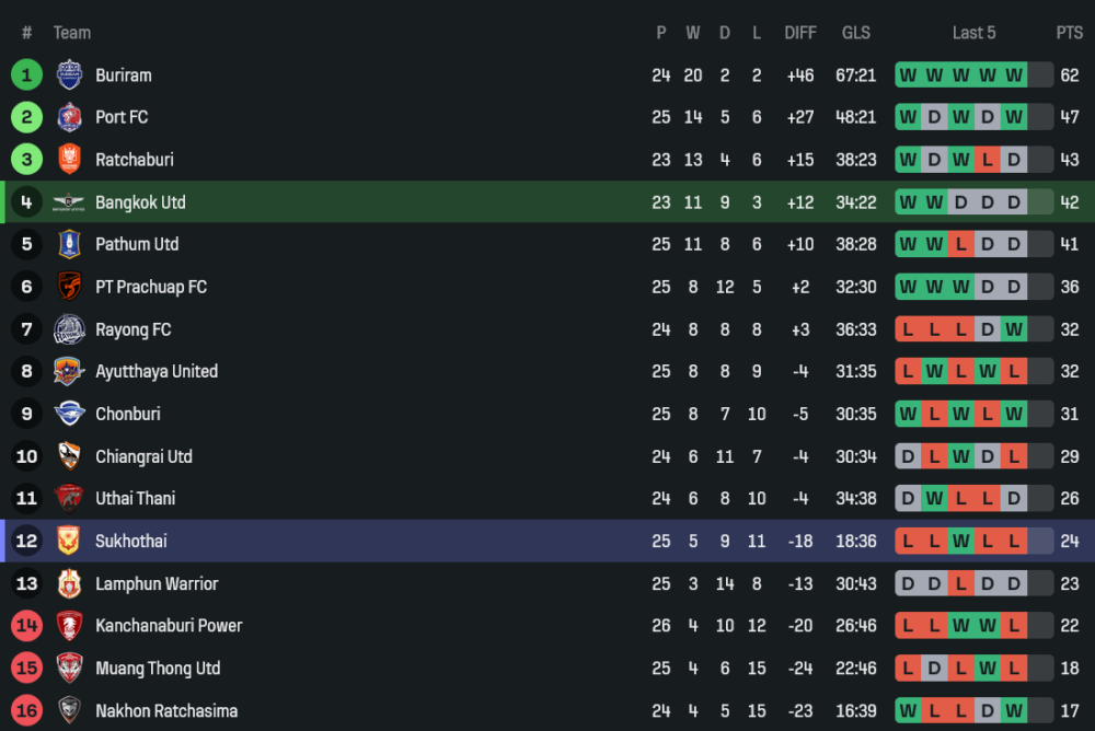 ฝั่งสุโขทัยฟอร์มสวนทางชัดเจน 5 นัดหลังแพ้ถึง 4 เกม ชนะได้แค่ครั้งเดียว เริ่มจากแพ้ ชลบุรี 0-2, แพ้ กาญจนบุรี พาวเวอร์ 0-1, ชนะ ระยอง 2-1, แพ้ บีจี ปทุม ยูไนเต็ด 1-2 และแพ้ บุรีรัมย์ ยูไนเต็ด 0-6 ฟอร์มลักษณะนี้สะท้อนชัดว่าทีมยังมีปัญหาทั้งความแน่นอนในเกมรับและความมั่นใจในเกมรุก ยิ่งเจอคู่แข่งที่ครองบอลเก่งและบุกต่อเนื่อง โอกาสเสียรูปก็มีสูงมาก