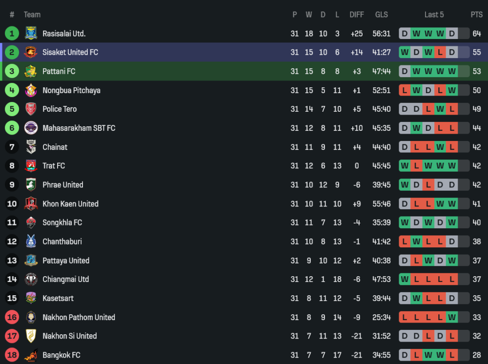 ศรีสะเกษ ยูไนเต็ด ฟอร์มช่วงหลังเหนียวแน่นกว่า 5 นัดหลังไม่แพ้ใคร ชนะ 3 เสมอ 2 เริ่มจากเสมอเกษตรศาสตร์ 1-1 ชนะโปลิศ เทโร 2-1 ชนะจันทบุรี 1-0 เสมอนครศรี ยูไนเต็ด 2-2 และบุกชนะบางกอก เอฟซี 2-1 ทีมเยือนชุดนี้อาจไม่ได้ถล่มคู่แข่งบ่อย แต่เล่นด้วยความนิ่งและเก็บแต้มได้ต่อเนื่องแบบทีมลุ้นยาว