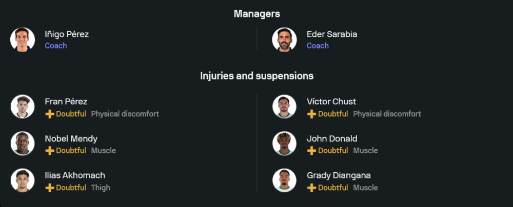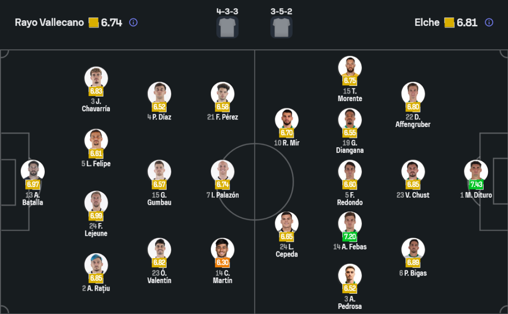 อิญิโก เปเรซ จะไม่มี ปาเธ่ ซิลเซ่ ที่ติดโทษแบน ส่วนตัวเจ็บยังมี ดีเอโก้ เมนเดซ และ อิเลียส อาโกมาช ที่ลงไม่ได้ คาดว่าทีมจะมาในระบบ 4-3-3 ใช้ การ์ลอส มาร์ติน, เปโดร ดิอาซ และ ฟราน เปเรซ ขับเคลื่อนเกมรุกด้านหลัง ฆอร์เก้ เด ฟรูตอส จุดเด่นของราโยยังอยู่ที่จังหวะเล่นในบ้านที่ค่อนข้างมีระเบียบ และเกมรับไม่เสียกันง่าย ๆ