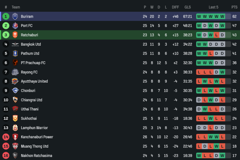 ราชบุรี 5 นัดหลัง ฟอร์มยังมีสะดุดให้เห็น เสมอ บีจี ปทุม ยูไนเต็ด 2-2 แพ้ อยุธยา เอฟซี 1-2 แพ้ กัมบะ โอซาก้า 1-2 เสมอ กัมบะ โอซาก้า 1-1 และชนะ อุทัยธานี 3-1 ภาพรวมคือเกมรุกยังพอมีทีเด็ด แต่เกมรับยังมีจังหวะพลาดง่าย โดยเฉพาะเวลาถูกกดดันต่อเนื่องจากคู่แข่งที่คุณภาพสูงกว่า