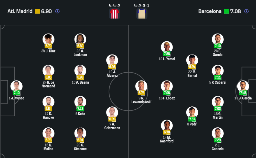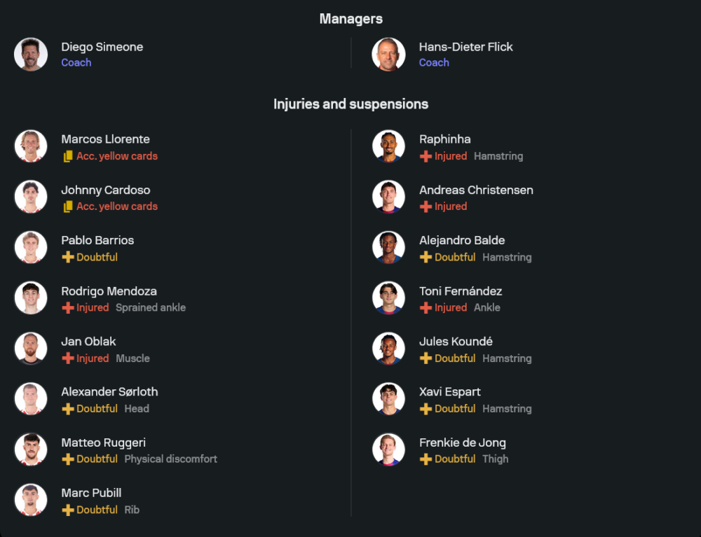 เจ้าถิ่นยังมาในระบบ 4-4-2 ตามสไตล์ถนัด แต่มีปัญหาจากการขาด จอห์นนี่ คาร์โดโซ่ และ มาร์กอส ยอเรนเต้ ที่ติดโทษแบน ส่วนตัวที่ต้องเช็กสภาพยังมีอีกหลายราย กระนั้นแกนหลักหลายคนยังอยู่กันครบ โดยเกมรุกจะฝากความหวังไว้ที่ อองตวน กรีซมันน์ กับ ฮูเลี่ยน อัลวาเรซ ขณะที่แดนกลางมี โกเก้, อเล็กซ์ บาเอน่า และ อเดโมล่า ลุคแมน ช่วยขับเกม เจ้าถิ่นอาจไม่สมบูรณ์ที่สุด แต่เรื่องความเขี้ยวและความดุดันยังไว้ใจได้