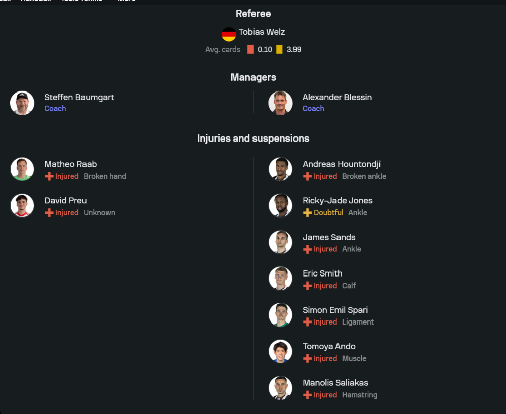 สเตฟเฟน เบาม์การ์ทยังต้องรีบพาทีมลืมเกมแพ้บาเยิร์น 0-4 ให้เร็วที่สุด แต่ข่าวดีคือแกนหลักหลายรายยังพร้อมลงสนาม และ อันดราส ชาเฟอร์ กลับมาเป็นตัวเลือกได้อีกครั้ง คาดว่าเจ้าถิ่นจะยึดระบบ 3-5-2 มี เฟรเดริก รอนโนว์ เฝ้าเสา แนวรับใช้ ดิโอโก้ ไลเต้, เลโอโพลด์ เคอร์เฟลด์ และ ดานิโล่ ดูกีห์ แดนกลางมี รานี่ เคดิร่า, อัลโยชา เคมไลน์, ชาเฟอร์ รวมถึงวิงแบ็กอย่าง เดอร์ริค โคห์น และ ยานิค ฮาเบอเรอร์ ส่วนเกมรุกฝากไว้กับ อีลิยาส อันซาห์ และ อังเดร อิลิช