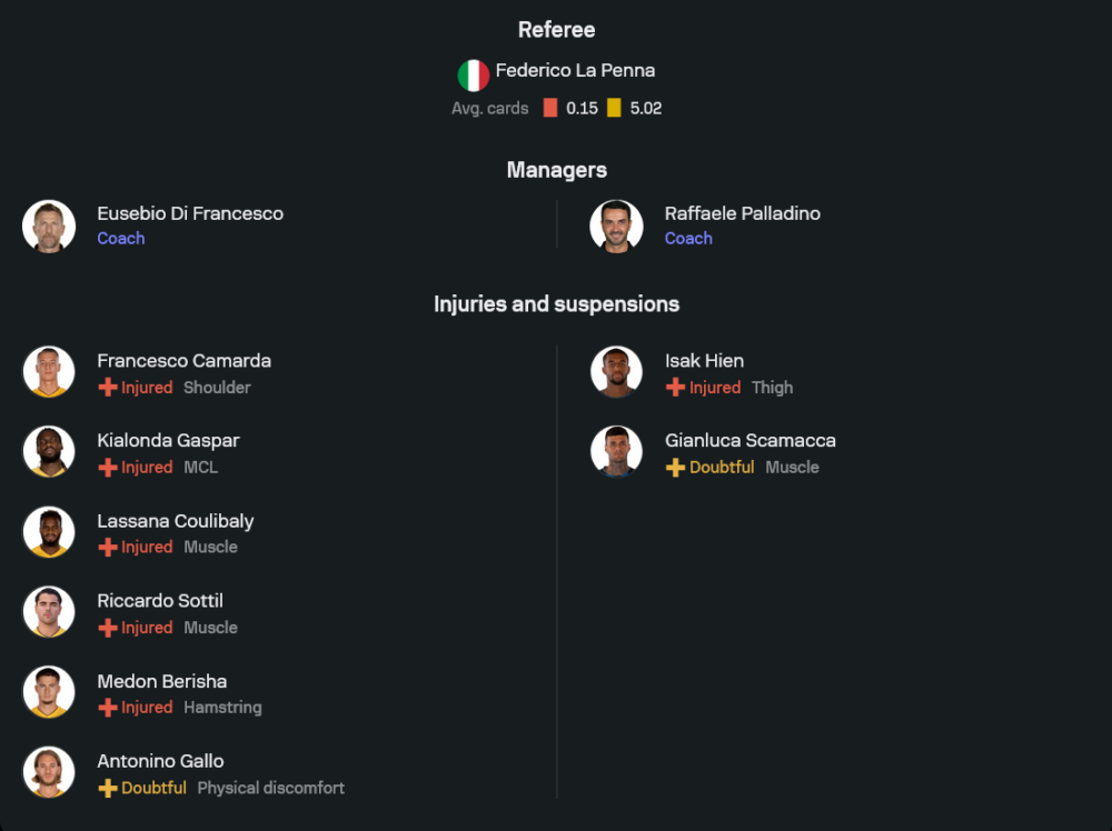 ราฟฟาเอเล่ ปัลลาดิโน น่าจะยึดแผน 3-4-2-1 ตามถนัด คาร์เนเซ็คคี่ ลงเฝ้าเสา แนวรับมี สคัลวินี่, ฌิมซิติ และ โคลาซินัช วิงแบ็กเป็น ซัปปาคอสต้า กับ แบร์นาสโคนี่ กลางสนามใช้ เดอ รอน กับ เอแดร์ซอน ขับเคลื่อนเกม โดยมี เดอ เคเตลาเรอ กับ ซาเลฟสกี้ ปั้นเกมอยู่หลัง คริสโตวิช แม้ยังไม่มี เฮียน และ สคามัคก้า แต่ภาพรวมยังดูแน่นกว่าเจ้าถิ่น และมีตัวรุกที่พร้อมสร้างความแตกต่างได้มากกว่า