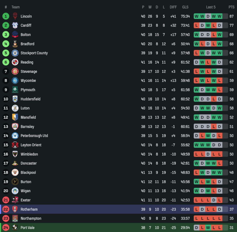 ร็อตเธอร์แฮมเองก็ไม่ได้ดีกว่ามาก 5 นัดหลังไม่ชนะใคร เสมอ 2 แพ้ 3 จุดที่น่ากังวลคือเกมเยือน เพราะลงเล่นนอกบ้านในลีก 19 นัด ชนะได้แค่ 3 เสมอ 2 แพ้ถึง 14 และ 3 เกมเยือนหลังสุดแพ้รวด ยิงใครไม่ได้เลย แต่ข้อดีเล็กๆ คือบางนัดพวกเขายังประคองเกมรับได้ดี โดยเฉพาะเกมเสมอสตีฟเนจ 0-0 และเสมอโบลตัน 2-2