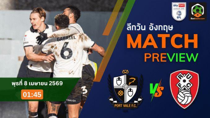 ศึก ลีก วัน อังกฤษ คืนวันพุธที่ 8 เมษายน 2569 เวลา 01:45 น. ที่สนามวาล พาร์ค คือเกมที่มีค่ามากกว่า 3 แต้ม เมื่อ พอร์ท เวล อันดับ 24 เปิดบ้านรับ ร็อตเธอร์แฮม ยูไนเต็ด อันดับ 22 ในการดวลของสองทีมที่ยังต้องกัดฟันหนีโซนอันตรายแบบไม่มีทางเลือก ราคาบอลวันนี้เปิดมา เสมอ สะท้อนชัดว่าเกมนี้ออกได้ทุกหน้า และสำหรับแฟนบอลที่กำลังไล่เช็ก ตารางบอลวันนี้ คู่นี้ถือเป็นอีกแมตช์ที่ความกดดันจะทำให้รูปเกมเข้มข้นเกินอันดับบนตารางแน่นอน