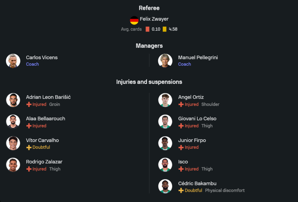 ฝั่งของ มานูเอล เปเยกรินี่ ก็มีตัวเจ็บหลายรายเช่นกัน ทั้ง อังเกล ออร์ติซ, โจวานี่ โล เซลโซ, จูเนียร์ ฟีร์โป และ อิสโก้ ที่ยังไม่พร้อมเต็มร้อย ส่วน เซดริก บากัมบู ยังต้องลุ้นสภาพร่างกาย ทำให้ชุดที่ลงสนามมีแนวโน้มยึดโครงหลักในระบบ 4-3-3 หรือขยับใกล้เคียงกัน โดยมี เบเยริน, ยอเรนเต้, นาตาน และผู้เล่นฝั่งซ้ายคอยประคองแนวรับ แดนกลางใช้ ฟอร์นัลส์, อัมราบัต และ จอห์นนี ส่วนเกมรุกฝากความหวังไว้ที่ อันโตนี่, คูโช เอร์นานเดซ และ เอซซัลซูลี่ ซึ่งยังเป็นจุดแข็งที่สุดของทีมชุดนี้