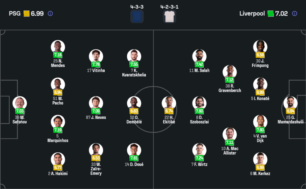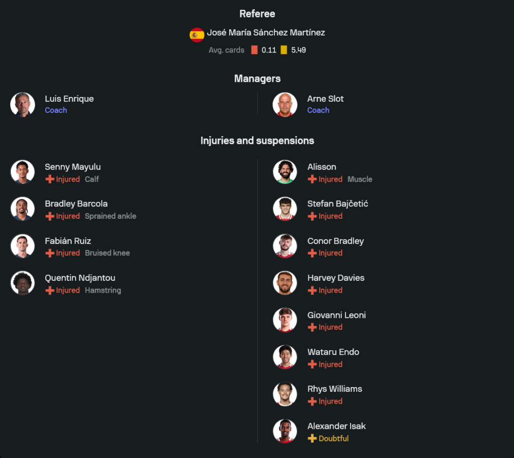 เปแอสเชของ หลุยส์ เอ็นริเก้ มาในระบบ 4-3-3 แม้จะมีตัวเจ็บอย่าง เซนนี่ มายูลู, แบรดลีย์ บาร์โคล่า, ฟาเบียน รุยซ์ และ เควนติน เอ็นเดียนตู แต่แกนหลักที่เหลือยังพร้อมลุยเต็มสูบ แนวรับมี ซาโฟนอฟ เฝ้าเสา กองหลังใช้งาน ฮาคิมี่, มาร์กินญอส, เบรัลโด้ และ นูโน่ เมนเดส แดนกลางมี วิตินญ่า, ชูเอา เนเวส และ ควารัตสเคเลีย ส่วนเกมรุกใช้ เดมเบเล่, ดูเอ้ และ ซาอีร์ เอเมอรี่ สลับขยับเล่นงานแนวรับคู่แข่ง จุดเด่นของทีมชุดนี้คือความเร็ว การเพรสสูง และการเข้าทำที่หลากหลาย