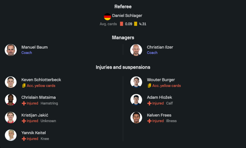เอาก์สบวร์กของ มานูเอล บอม ยังอยู่ในช่วงที่หาจุดลงตัวไม่เจอ แถมเกมนี้จะหมดสิทธิ์ใช้งาน เคเวน ชล็อตเตอร์เบ็ค ที่ติดโทษแบน ทำให้แนวรับต้องมีการปรับทันที โดยทีมยังน่าจะยึดระบบ 3-4-2-1 ตามเดิม มี ฟินน์ ดาห์มัน เฝ้าเสา แผงหลังใช้ อาร์ตูร์ ชาเวส, เยฟเฟรย์ กูเวลูว์ และ เซดริก เซซิเกอร์ ขณะที่วิงแบ็กสองฝั่งมี โรบิน เฟลล์เฮาเออร์ กับ ดิมิทริส จานนูลิส คอยเติมเกม เกมรุกฝากความหวังไว้ที่ อเล็กซิส โคล้ด-มอริซ, อันทอน คาเดอ และหน้าเป้าอย่าง โรดริโก้ ริเบโร่