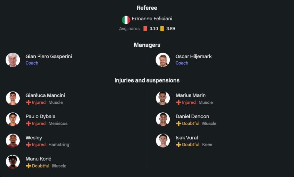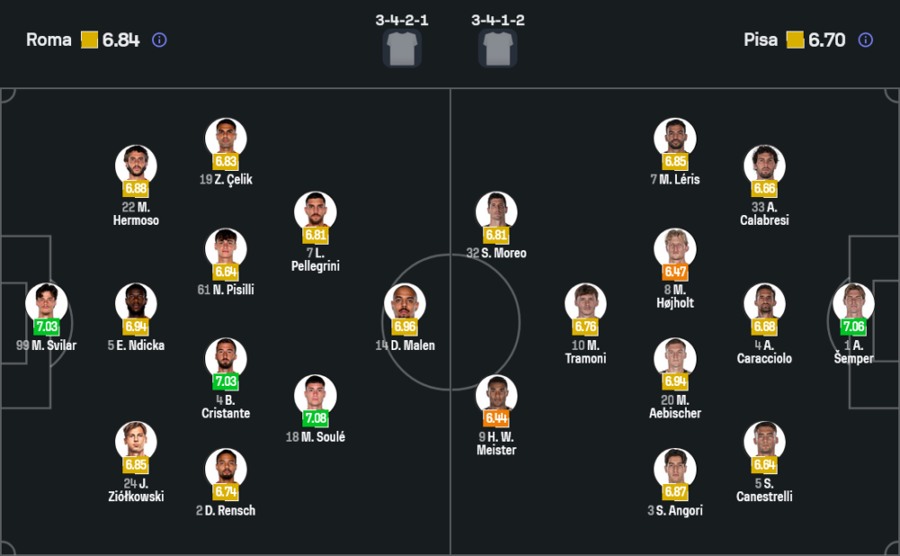 โรม่า ของ จาน ปิเอโร่ กาสเปรินี่ ยังต้องแก้เกมหลังนัดล่าสุดเสียถึง 5 ประตูให้ อินเตอร์ มิลาน แต่การกลับมาเล่นในบ้านน่าจะช่วยยกระดับความมั่นใจได้ไม่น้อย สภาพทีมยังมีตัวเจ็บอย่าง จานลูก้า มันชินี่, เปาโล ดิบาล่า และ เวสลีย์ ส่วน มานู โกเน่ ยังต้องเช็กความพร้อมอีกครั้ง ระบบที่คาดว่าจะใช้คือ 3-4-2-1 โดยมี ไมล์ สวิลาร์ ยืนด่านสุดท้าย แดนกลางนำโดย ไบรอัน คริสตานเต้ ส่วนเกมรุกฝากความหวังไว้ที่ มาติอัส ซูเล่, ลอเรนโซ่ เปเยกรินี่ และ ดอนเยลล์ มาเลน ที่จะยืนเป็นหน้าเป้า