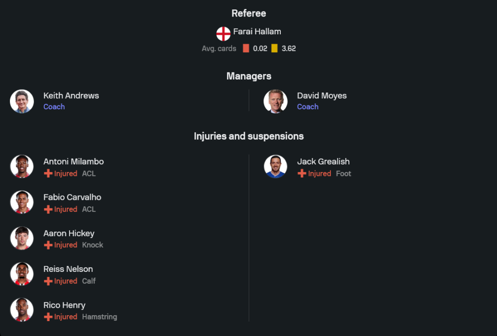 ฝั่งเอฟเวอร์ตันดูพร้อมกว่าในภาพรวม โดย เดวิด มอยส์ น่าจะยึดระบบ 4-2-3-1 ตามถนัด พิคฟอร์ด เฝ้าเสา แผงหลังมี โอไบรเอน, ทาร์คอฟสกี้, แบรนธ์เวต และ มีโคเลนโก้ แดนกลางใช้ กูเอเย่ กับ การ์เนอร์ คุมเกมร่วมกัน ส่วนแนวรุกมี แม็กนีล, ดิวส์บิวรี-ฮอลล์ และ เอ็นดิอาย คอยปั้นเกมให้ เบโต้ ยืนจบสกอร์หน้าเป้า แม้จะไม่มี แจ็ค กรีลิช แต่โครงสร้างหลักของทีมยังแน่นและลงตัว