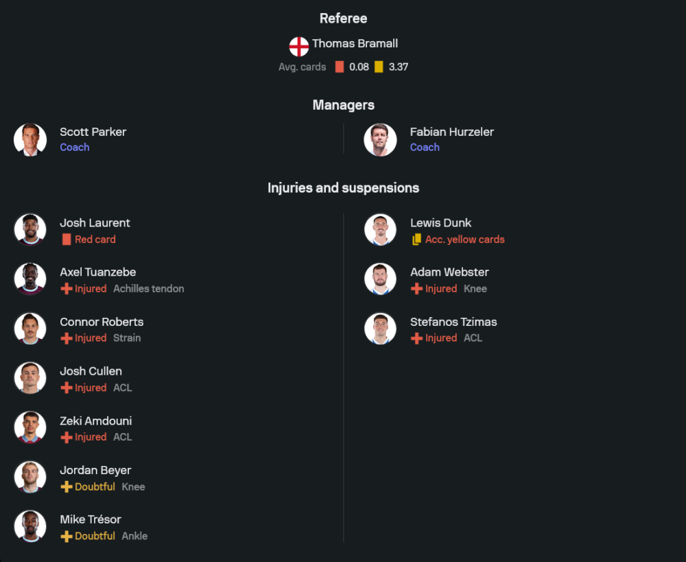 ฝั่งไบรท์ตันของ ฟาเบียน ฮูร์เซเลอร์ ขาด ลูอิส ดังค์ ที่ติดโทษแบน และยังไม่มี อดัม เว็บสเตอร์ กับ สเตฟานอส ซิมาส ที่บาดเจ็บ แต่ภาพรวมถือว่ายังดูพร้อมกว่าเจ้าบ้านพอสมควร เพราะแกนหลักหลายรายยังอยู่กันครบ โดยเฉพาะแนวรุกและแดนกลางที่กำลังเล่นด้วยความมั่นใจ
