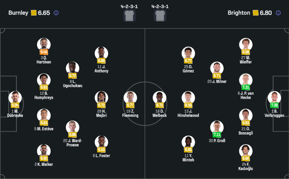 ไบรท์ตันน่าจะมาในระบบ 4-2-3-1 เช่นกัน บาร์ต แฟร์บรู้กเก้น ลงเฝ้าเสา แนวรับมี มัตส์ วีฟเฟอร์, แยน พอล ฟาน เฮ็คเก้, โอลิวิเยร์ บอสกาญี่ และ แฟร์ดี คาดิโอกลู แดนกลางใช้ เจมส์ มิลเนอร์ กับ ปาสคาล โกรส คุมจังหวะเกม ส่วนแนวรุกมี ดิเอโก้ โกเมซ, แจ็ค ฮินเชลวู้ด และ คาโอรุ มิโตมะ คอยปั้นเกมให้ แดนนี่ เวลเบ็ค ล่าตาข่าย