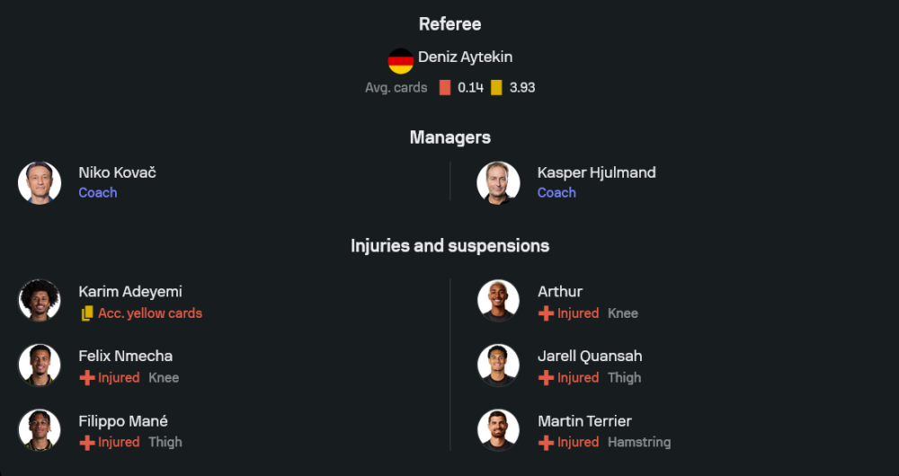 นิโก้ โควัค กำลังพาทีมเล่นด้วยความมั่นใจเต็มที่ หลังเก็บชัย 4 นัดรวดในลีก แม้เกมนี้จะหมดสิทธิ์ใช้งาน คาริม อเดเยมี่ ที่ติดโทษแบน รวมถึง เฟลิกซ์ เมช่า และ ฟิลิปโป้ มาเน่ ที่ยังเจ็บ แต่แกนหลักเกมรุกยังอยู่กันครบ เชห์รู กีราสซี่ จะยืนหน้าเป้า โดยมี มักซิมิเลี่ยน ไบเออร์ กับ ยูเลี่ยน บรันด์ คอยสนับสนุนจากด้านหลัง แดนกลางใช้ โจ๊บ เบลลิ่งแฮม กับ มาร์เซล ซาบิตเซอร์ คุมจังหวะในระบบ 3-4-2-1 ที่กำลังลงตัว