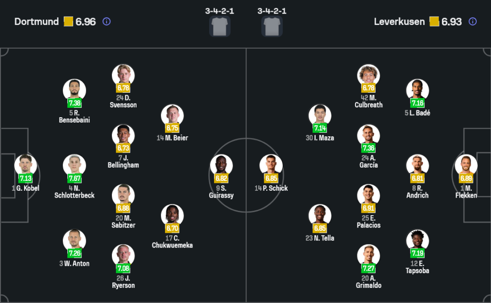 ฝั่งทีมเยือนของ แคสเปอร์ ฮยุลมันด์ ได้แรงกระตุ้นกลับมาไม่น้อยหลังยิงโวล์ฟสบวร์ก 6-3 และยังมีข่าวดีเมื่อ อเล็กซ์ การ์เซีย พ้นโทษแบนกลับมาช่วยแดนกลางอีกครั้ง ส่วนแนวรุกยังนำโดย ปาทริค ชิค ที่พร้อมยืนค้ำหน้าในระบบ 3-4-2-1 มี อิบราฮิม มาซ่า กับตัวรุกอีกหนึ่งรายคอยปั้นเกมด้านหลัง อย่างไรก็ตาม ปัญหาของเลเวอร์คูเซ่นยังอยู่ที่แนวรับ เพราะมีตัวเจ็บหลายรายทั้ง อาร์ตูร์, จาเรลล์ ควอนซาห์ และ มาร์กแต็ง เตร์ริเย่ร์ ทำให้เกมนี้ต้องเน้นความรัดกุมมากเป็นพิเศษ