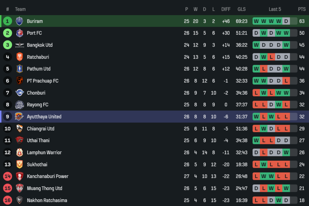 อยุธยา 5 เกมหลัง ชนะ 2 แพ้ 3 ผลงานล่าสุดบุกแพ้ ลำพูน วอริเออร์ 0-2 ต่อด้วยแพ้ นครราชสีมา 0-1 แต่ก็มีช่วงคืนฟอร์มด้วยการชนะ ราชบุรี 2-1 และชนะ ชลบุรี 1-0 ก่อนแพ้ กาญจนบุรี พาวเวอร์ 0-2 สถิติโดยรวมของทีมคือ ชนะ 8 เสมอ 8 แพ้ 10 ยิงเฉลี่ย 1.19 ประตูต่อเกม และเสีย 1.42 ลูกต่อเกม ซึ่งสะท้อนว่าฟอร์มยังไม่นิ่ง และแนวรับยังมีจุดให้คู่แข่งเจาะได้