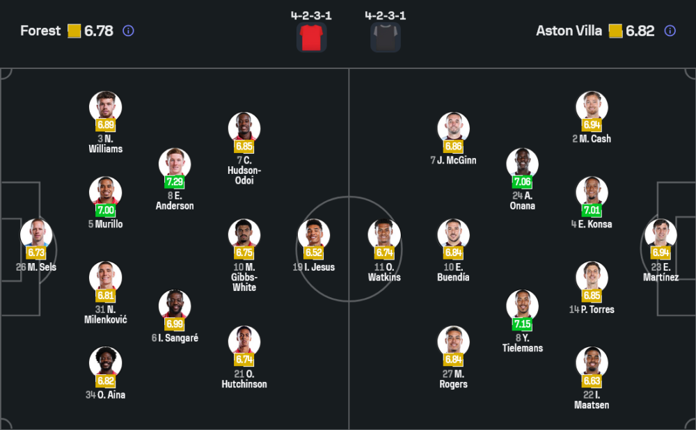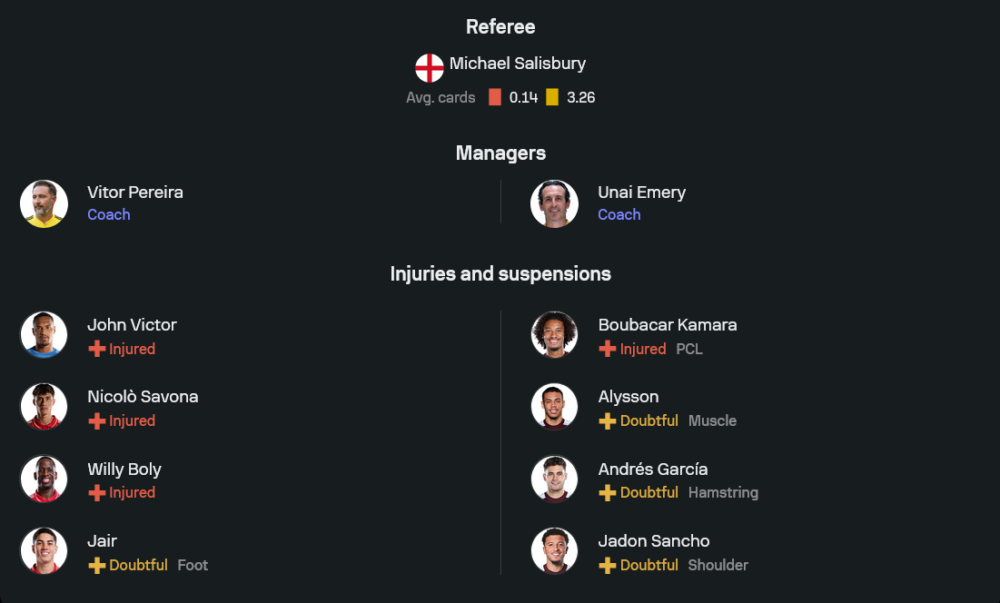 อูไน เอเมรี่ มีขุมกำลังค่อนข้างพร้อม แม้ยังขาด บูบาก้าร์ กามาร่า และต้องลุ้นความฟิตของบางรายอย่าง เจดอน ซานโช่, อลิสซง และ อันเดรส การ์เซีย แต่ตัวหลักส่วนใหญ่ยังอยู่กันครบ ระบบยังเป็น 4-2-3-1 เช่นกัน มาร์ติเนซ ยืนเฝ้าเสา แนวรับมี แม็ตตี้ แคช, คอนซ่า, เปา ตอร์เรส และ มาตเซ่น กลางสนามใช้ โอนาน่า กับ ตีเลอมันส์ ขับเคลื่อนเกม ส่วนแนวรุกมี แม็คกินน์, บูเอนเดีย และ มอร์แกน โรเจอร์ส สนับสนุน โอลลี่ วัตกิ้นส์ ที่พร้อมล่าตาข่าย