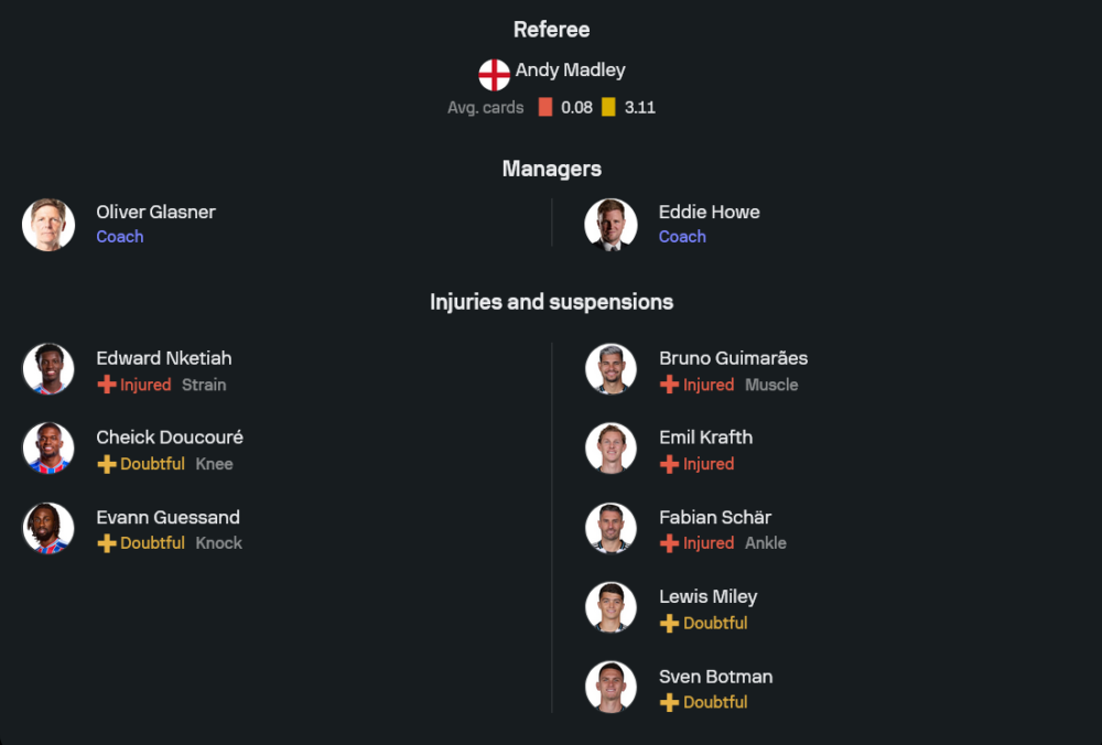 ฝั่ง เอ็ดดี้ ฮาว เตรียมวางหมากในระบบ 4-2-3-1 ผู้รักษาประตูเป็น อารอน แรมสเดล แนวรับมี ติโน่ ลิฟราเมนโต้, มาลิค เธียว, แดน เบิร์น และ ลูอิส ฮอลล์ แดนกลางใช้ ซานโดร โตนาลี่ จับคู่กับ โชเอลินตอน ส่วนแนวรุกมี ฮาร์วี่ย์ บาร์นส์, นิค วอลเตอมาเด้อ, แอนโธนี่ อีลังก้า และดัน แอนโธนี่ กอร์ดอน เป็นตัวจบสกอร์ ปัญหาคือทีมยังขาดแข้งสำคัญหลายรายทั้ง บรูโน่ กีมาไรส์, ฟาเบียน ชาร์, เอมิล คราฟธ์ รวมถึงตัวที่ยังไม่เต็มร้อยอย่าง ลูอิส ไมลี่ย์ และ สเวน บ็อตมัน ทำให้ความแน่นของทีมลดลงพอสมควร