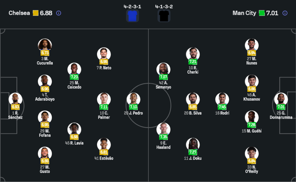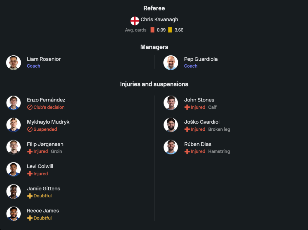 เชลซีของ เลียม โรซีเนียร์ ยังเจอปัญหาขุมกำลังพอสมควร โดย เอ็นโซ่ เฟร์นานเดซ ไม่มีชื่อจากการตัดสินใจของสโมสร ขณะที่ มิไคโล มูดริค ติดแบน ส่วน ฟิลิป ยอร์เกนเซ่น, ลีไว โคลวิลล์, เจมี กิตเท่นส์ และ รีซ เจมส์ ยังไม่สมบูรณ์ ทำให้ทีมต้องจัดทัพอย่างระมัดระวังในระบบ 4-2-3-1 โรเบิร์ต ซานเชซ ลงเฝ้าเสา แนวรับมี มาโล กุสโต้, เวสลี่ย์ โฟฟาน่า, โตซิน อดาราบิโอโย่ และ มาร์ก กูกูเรญ่า แดนกลางใช้ โรเมโอ ลาเวีย กับ มอยเซส ไซเซโด้ ส่วนเกมรุกวาง เปโดร เนโต้, โคล พัลเมอร์ และ เอสเตเวา คอยสนับสนุน เชา เปโดร ที่ยืนหน้าเป้า ความหวังของเจ้าถิ่นยังอยู่ที่จังหวะสร้างสรรค์ของพัลเมอร์ แต่ปัญหาคือความสม่ำเสมอของทั้งทีมยังไม่นิ่ง