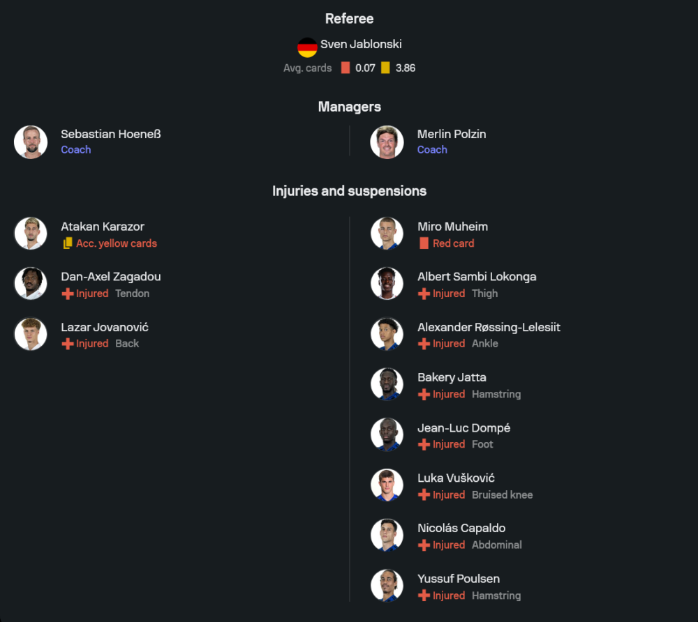 ฝั่งฮัมบูร์กก็มีปัญหาไม่แพ้กัน มิโร่ มูไฮม์ ติดโทษแบนจากใบแดง ขณะที่ลิสต์ตัวเจ็บยังมีหลายรายทั้ง อเล็กซานเดอร์ เรอซิง-เลเลซิอิต, บาเครี่ ยัตต้า, นิโคลัส คาปัลโด้, ฌอง-ลุค ดอมเป้ และ ยุสซุฟ โพลเซ่น แต่ข่าวดีคือ นิโคไล เรมเบิร์ก พ้นโทษแบนกลับมาช่วยแดนกลางได้ทันเวลา