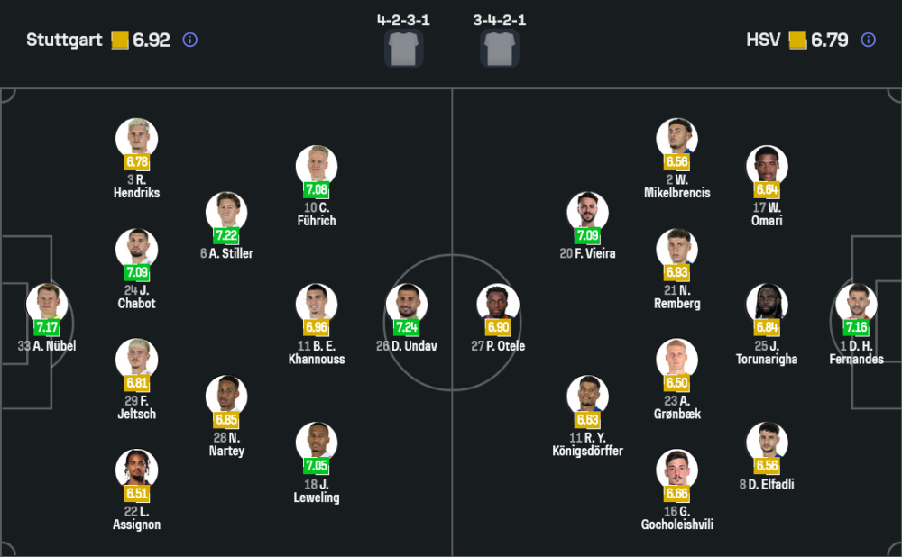 ในระบบ 4-2-3-1 สตุ๊ตการ์ทน่าจะวาง อเล็กซานเดอร์ นูเบล เฝ้าเสา แผงหลังมี ลอเรนซ์ อัสซิญง, ฟินน์ เยลท์ช, เจฟฟ์ ชาบ็อต และ รามอน เฮนดริกส์ แดนกลางใช้อังเจโล่ สติลเลอร์ เป็นตัวคุมจังหวะ โดยมี อุนดาฟ ยืนปั้นเกมร่วมกับ ฟูห์ริช และ เลเวลลิ่ง สนับสนุน เดมิโรวิช ที่ยืนค้ำเป็นหน้าเป้า