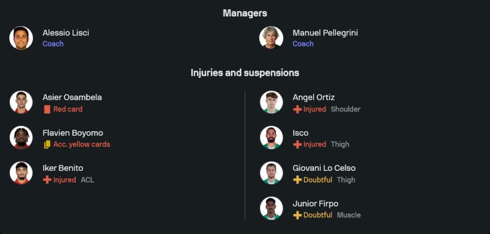 ฝั่งเรอัล เบติส ยังหมดสิทธิ์ใช้งาน อังเคล ออร์ติซ, อิสโก้, โจวานี่ โล เซลโซ่ และ จูเนียร์ ฟีร์โป้ ที่ยังมีปัญหาอาการบาดเจ็บ แต่ขุมกำลังหลักที่เหลือยังอยู่กันครบ โดยจากภาพรวมตัวจริง เบติสมีแนวโน้มยืนในระบบ 4-3-3 มากกว่า เปิดเกมด้วยแนวรับที่มี เอคตอร์ เบเยริน, ดีเอโก้ ยอเรนเต้, มาร์ค บาร์ตร้า และแนวรับฝั่งซ้ายคอยคุมพื้นที่ กลางสนามมี จอห์นนี การ์โดโซ, ปาโบล ฟอร์นัลส์ และ ซอฟยาน อัมราบัต ส่วนเกมรุกใช้ อันโตนี่, อับเด เอซซัลซูลี่ และ คูโช่ เอร์นานเดซ เป็นสามตัวอันตราย จุดแข็งของทีมเยือนยังอยู่ที่ความเร็วและการเข้าทำจากด้านข้าง แต่การขาดตัวสร้างสรรค์เกมบางรายทำให้ประสิทธิภาพลดลงไปพอสมควร
