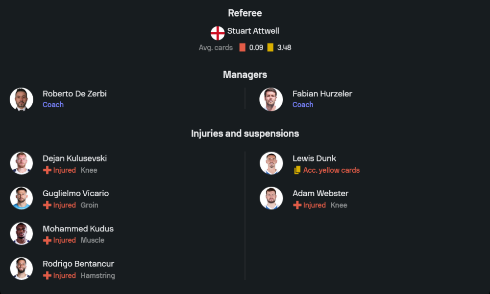 ไบรท์ตันของ ฟาเบียน ฮูร์เซเลอร์ สภาพทีมดูดีกว่า แม้จะไม่มี ลูอิส ดังค์ ที่ติดโทษแบน และ อดัม เว็บสเตอร์ ที่บาดเจ็บ แต่แกนหลักส่วนใหญ่ยังพร้อมลงสนาม เกมนี้มาในระบบ 4-2-3-1 ตามถนัด ซึ่งเป็นแผนที่ช่วยให้ทีมเล่นเกมรุกได้ลื่นและเปลี่ยนจังหวะเร็วได้อันตราย