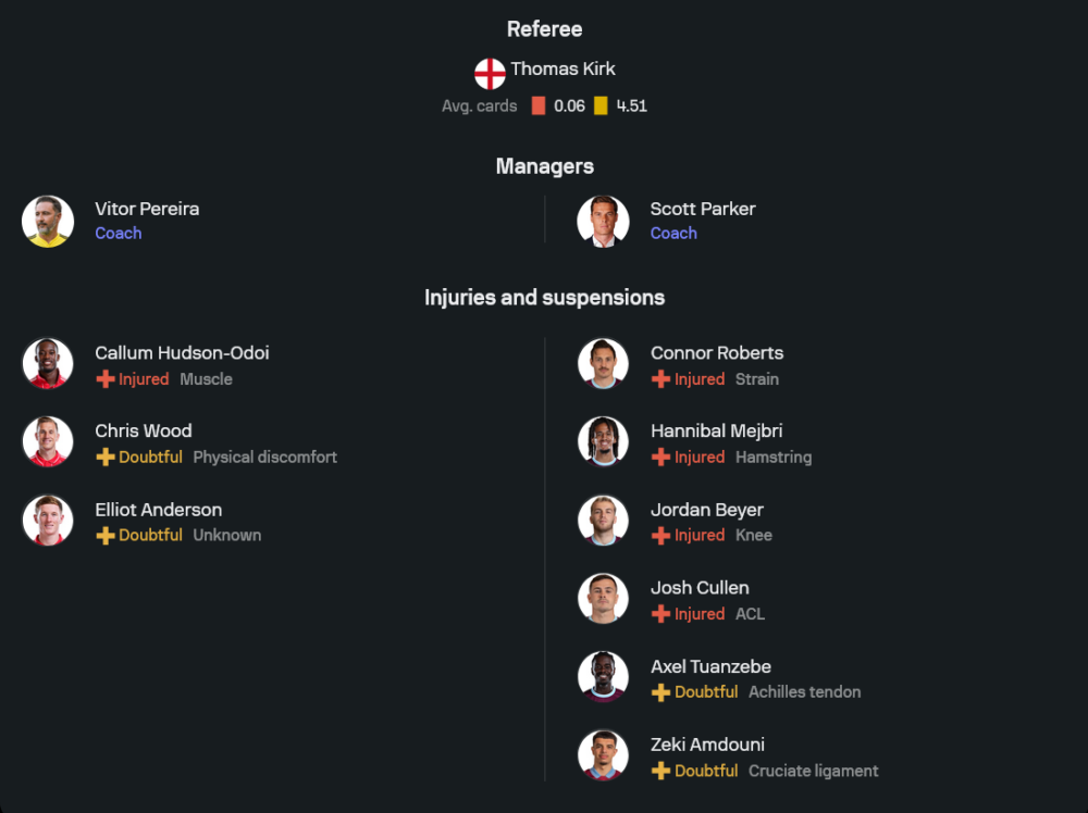 ฝั่งของ สกอตต์ ปาร์คเกอร์ ก็มีปัญหาผู้เล่นบาดเจ็บหลายตำแหน่งเช่นกัน ทั้ง คอนเนอร์ โรเบิร์ตส์, ฮานนิบาล เมย์บรี, จอร์แดน เบเยอร์ และ จอช คัลเล่น ที่ยังไม่เต็มร้อย แต่ทีมยังน่าจะยึดระบบ 4-2-3-1 เหมือนเดิม เพื่อเน้นความรัดกุมและรอสวนกลับ ผู้รักษาประตูเป็น มาร์ติน ดูบราฟก้า แนวรับมี บาเชียร์ ฮัมฟรีส์, ฮยัลมาร์ เอ็คดัล, มักซิม เอสเตฟ และ ฮาร์ตมัน แดนกลางใช้ เจมส์ วอร์ด-เพราส์ กับ จอช ลอเรนต์ คุมจังหวะ ส่วนตัวรุกเป็น มาร์คัส เอ็ดเวิร์ดส์, เลสลี่ย์ อูโกชุควู และ ไจดอน แอนโธนี่ คอยสนับสนุน เซียน เฟลมมิ่ง