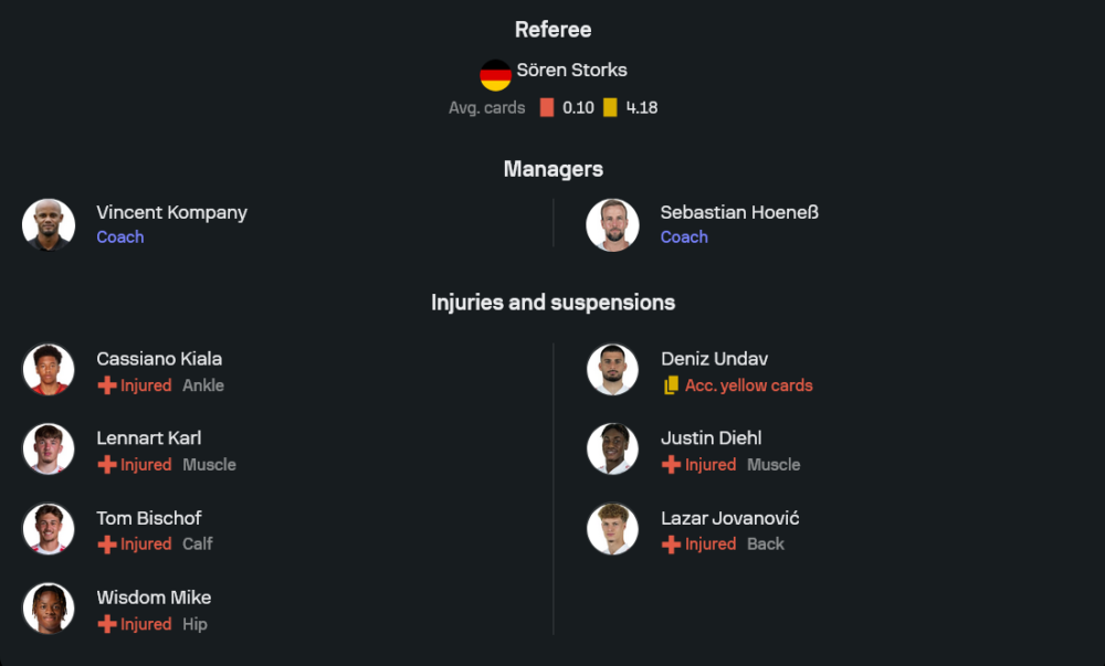 ฝั่งทีมเยือนของ เซบาสเตียน ฮูเนส สภาพทีมเสียหายพอสมควร เพราะจะไม่มี เดนิซ อุนดาฟ กองหน้าตัวหลักที่ติดโทษแบน ทำให้เกมรุกต้องฝากความหวังไว้ที่ เดมิโรวิช มากขึ้น โดยมี เลเวลลิ่ง, ฟูห์ริค และ นาร์ตีย์ สนับสนุนอยู่ด้านหลัง ขณะที่แดนกลางได้ คาราซอร์ กลับมาช่วยคุมจังหวะร่วมกับ สติลเลอร์ แต่การบุกมาเยือนบาเยิร์นในช่วงนี้ไม่ใช่งานง่ายแน่นอน
