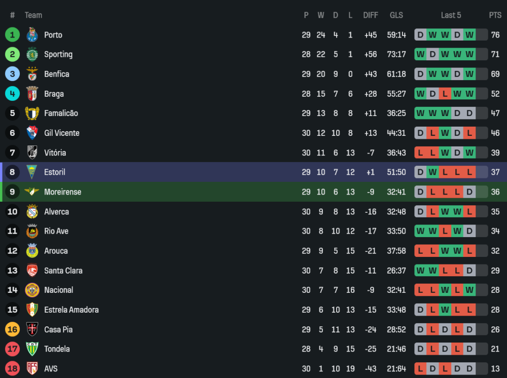 คู่นี้เจอกันทีไรสู้กันสนุกตลอด 5 นัดหลัง โมไรเรนเซ่ชนะ 2 เสมอ 3 และเอสโตริลยังไม่ชนะเลย ที่น่าสนใจคือ 3 เกมหลังสุดจบลงด้วยผลเสมอทั้งหมด 3-3, 2-2 และ 2-2 สะท้อนชัดว่าเป็นคู่ที่ค่อนข้างกินกันไม่ลง