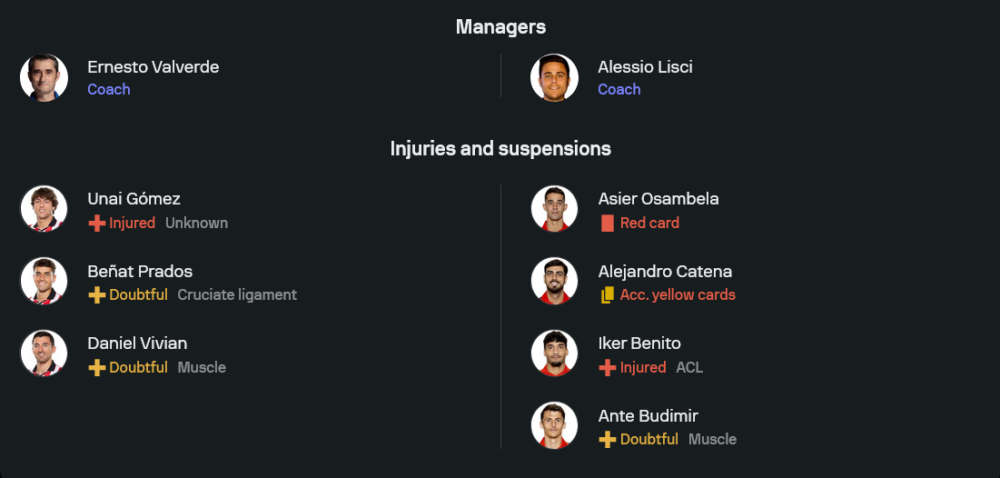 ด้านสภาพทีมยังมีบางจุดที่ต้องเช็ก โดย อูไน โกเมซ เจ็บ ขณะที่ เบนญัต ปราดอส และ ดานี บิเบียน ยังไม่สมบูรณ์เต็มร้อย แต่ภาพรวมถือว่ายังจัดทีมหลักลงสนามได้ค่อนข้างพร้อม จุดแข็งยังอยู่ที่เกมเพรสซิ่งและการขึ้นเกมจากด้านข้าง