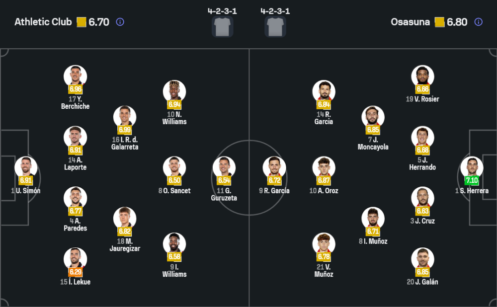 ฝั่งโอซาซูน่าก็ใช้ระบบ 4-2-3-1 เช่นกัน เซร์คิโอ เอร์เรร่า ยืนด่านสุดท้าย แนวรับมี โรซิเย่ร์, เอร์รานโด้, ครูซ และ ฆาบี กาลัน แดนกลางใช้ มอนคาโยล่า คุมจังหวะร่วมกับตัวตัดเกม ขณะที่แนวรุกวาง รูเบน การ์เซีย, ไอมาร์ โอรอซ และ บิคตอร์ มูนญอซ สนับสนุนหน้าเป้าอย่าง อันเต้ บูดิเมียร์