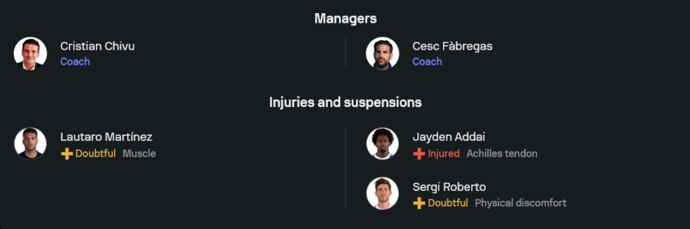 ฝั่งโคโม่ของ เชส ฟาเบรกัส อยู่ในช่วงที่ต้องเร่งเรียกความมั่นใจกลับมา หลังแพ้มา 2 นัดติด แม้รูปเกมยังพอมีจังหวะสู้ได้ แต่ปัญหาคือแนวรับเริ่มเสียสมดุลในช่วงสำคัญ อย่างไรก็ตาม เกมนี้พวกเขาจะกลับมาใช้แกนหลักหลายรายลงสนาม เพื่อสู้กับอินเตอร์ให้ดีที่สุด