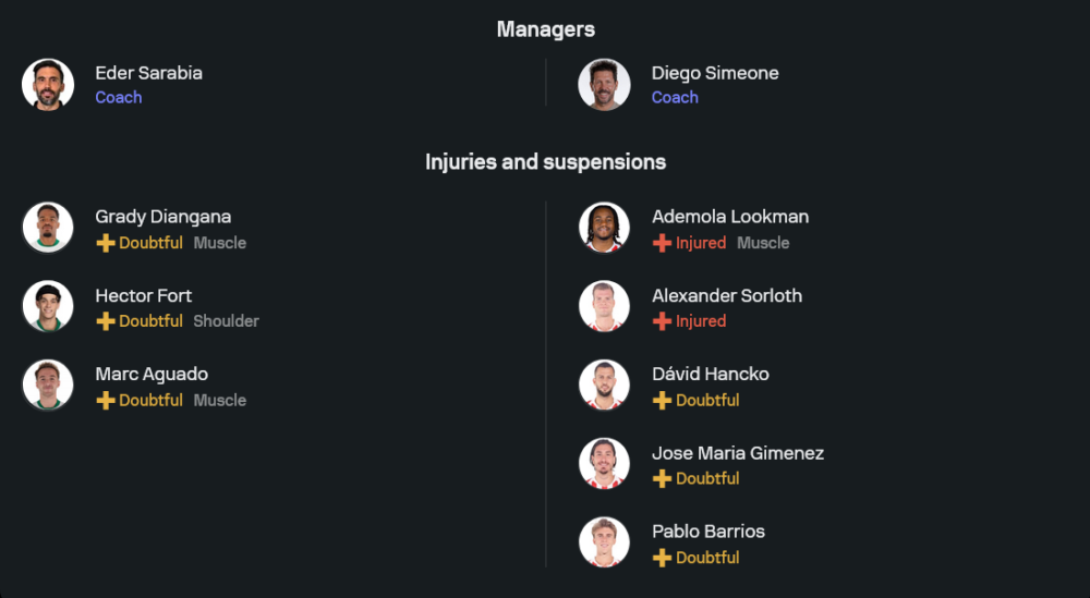 ฝั่ง ดีเอโก้ ซิเมโอเน่ เตรียมวางหมากในระบบ 4-4-2 โดยมี ฮวน มุสโซ่ เฝ้าเสา แนวรับใช้ ฮาเบียร์ โบนาร์, มาร์ค พูบิลล์, โรดริโก้ เมนโดซ่า และ อูโก้ ดิอ๊าซ แดนกลางมี ติอาโก้ อัลมาด้า และ อเล็กซ์ บาเอน่า คอยเชื่อมเกม ส่วนแนวรุกยังมี อองตวน กรีซมันน์ เป็นตัวอันตราย และวาง ฮูเลี่ยน อัลบาเรซ เป็นตัวจบสกอร์