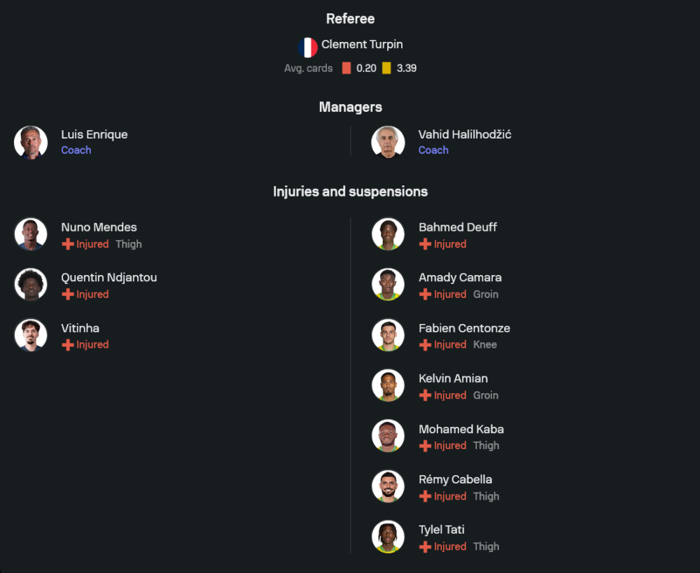 หลุยส์ เอ็นริเก้ ยังมีปัญหาเรื่องสภาพทีมอยู่บ้าง โดยกลุ่มที่ไม่สมบูรณ์มีทั้ง นูโน เมนเดส, กวินแต็ง เอ็นฌ็องตู และ วิตินญ่า แต่ขุมกำลังหลักส่วนใหญ่ยังพร้อม โดยเฉพาะแนวรุกที่ยังมี เดซีเร่ ดูเอ้, อุสมาน เดมเบเล่ และ ควิชา ควารัตสเคเลีย เป็นตัวอันตราย