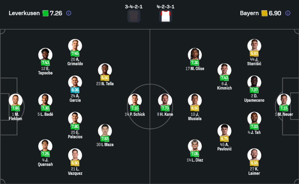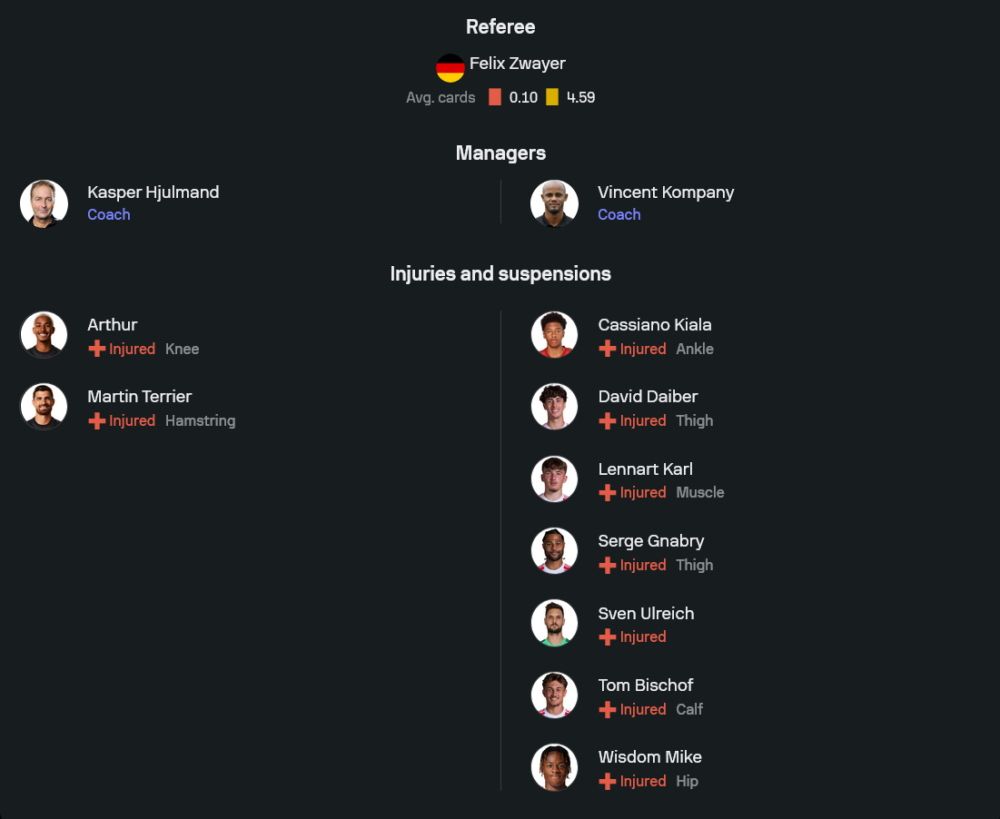 บาเยิร์นของ แว็งซองต์ กอมปานี มาในระบบ 4-2-3-1 พร้อมแนวรุกเต็มพิกัด แม้จะมีตัวเจ็บหลายรายอย่าง แซร์จ นาบรี้, เลนนาร์ท คาร์ล, ทอม บิสชอฟ และ สเวน อูลไรช์ แต่แกนหลักชุดใหญ่ยังอยู่กันครบ นำโดย แฮร์รี่ เคน ที่กำลังท็อปฟอร์ม มี ไมเคิล โอลิเซ่, จามาล มูเซียล่า และ หลุยส์ ดิอาซ คอยปั้นเกมด้านหลัง โดยแดนกลางมี คิมมิช กับ พาฟโลวิช คุมจังหวะ ความน่ากลัวของเสือใต้อยู่ที่เกมรุกหลากหลาย เปลี่ยนสปีดเร็ว และลงโทษคู่แข่งได้แทบทุกครั้งเมื่อมีพื้นที่